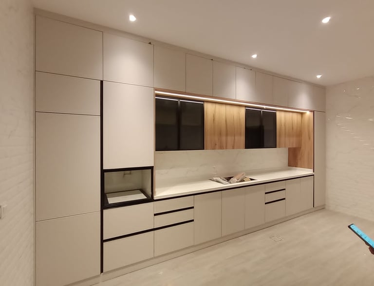 تصاميم مطابخ عصرية بخطوط نظيفة وتخطيط ذكي للمساحات، تركز على سهولة الاستخدام والاستفادة القصوى من التخزين مع تشطيبات أنيقة تدوم طويلًا.